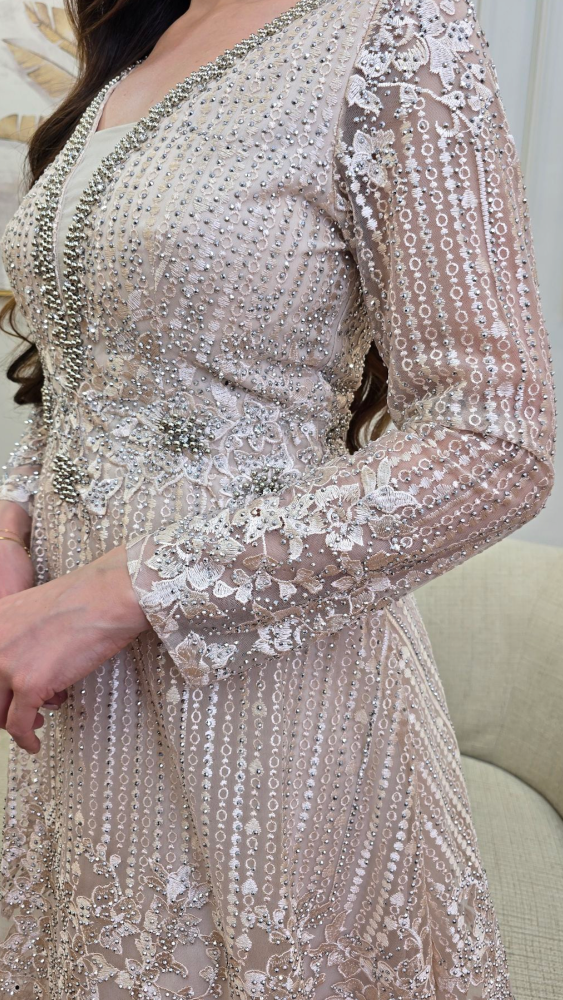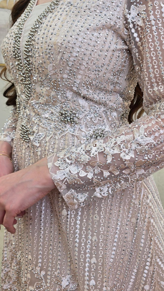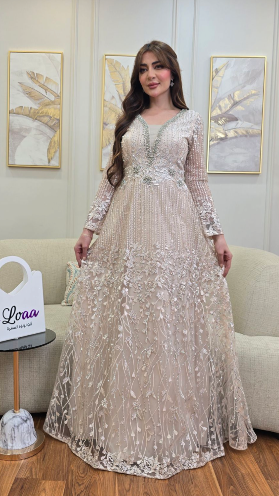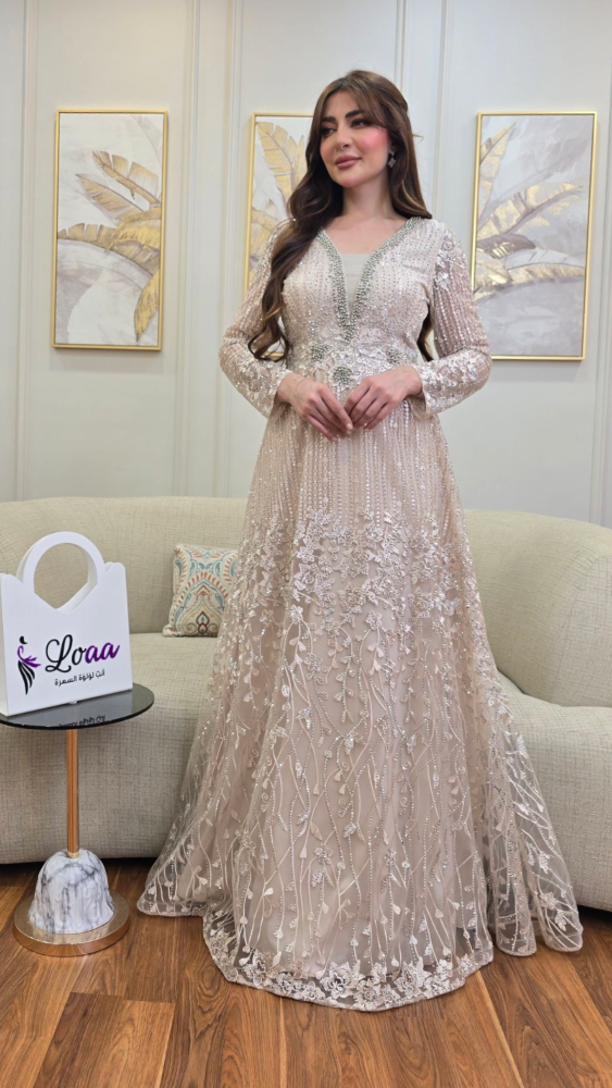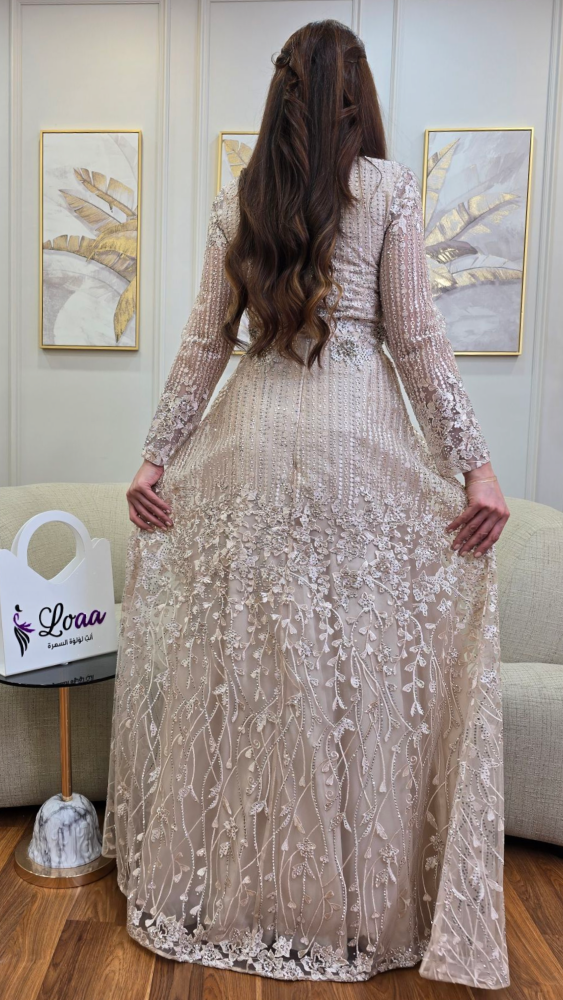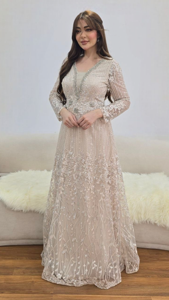 الفستان يأتي بلون بيج سكري ناعم ومشرق، مغطى بالكامل بتطريز يدوي فاخر من الخرز والستراس الفضي برسومات الأزهار والخطوط الانسيابية. تصميمه الملكي بقصة واسعة من الأسفل وأكمام طويلة مطرزة بالكامل يجمع بين الحشمة والجاذبية، مع فتحة رقبة جذابة على شكل V.