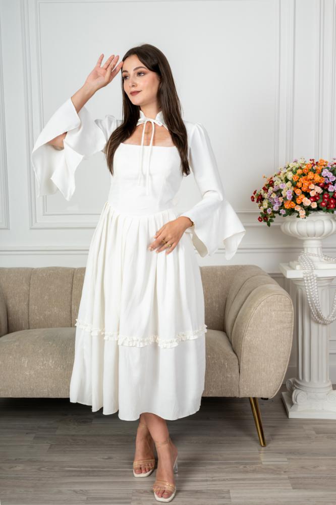 فستان أنثوي أبيض بأكمام فضفاضة وحواف دانتيلية