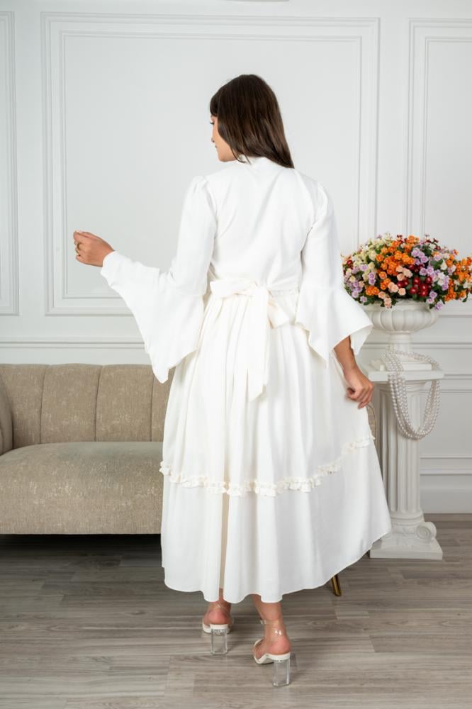 عززي إطلالتك بأناقة لا مثيل لها مع دريس ابيض ساده الميدي الناعم، الذي يجسد البساطة الراقية و يتميز بأكمام طويلة تنسجم تمامًا مع التنورة الواسعة والطويلة، مما يضمن لكِ راحة استثنائية من لؤه فاشن.