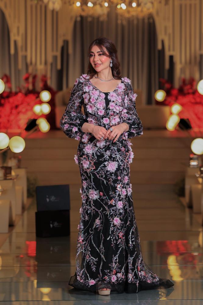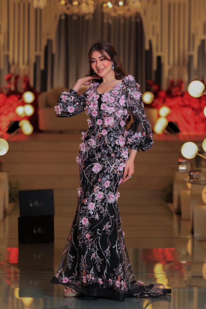 تألقي بإطلالة ساحرة مع هذا الفستان الفاخر المصنوع من تول أسود ناعم مزين بتطريز دقيق على شكل أزهار وردية ثلاثية الأبعاد وأوراق نباتية بخيوط لامعة. يتميز التصميم بقصة مستقيمة أنثوية تبرز تفاصيل الجسم مع أكمام شفافة منفوخة تضيف لمسة درامية جذابة.