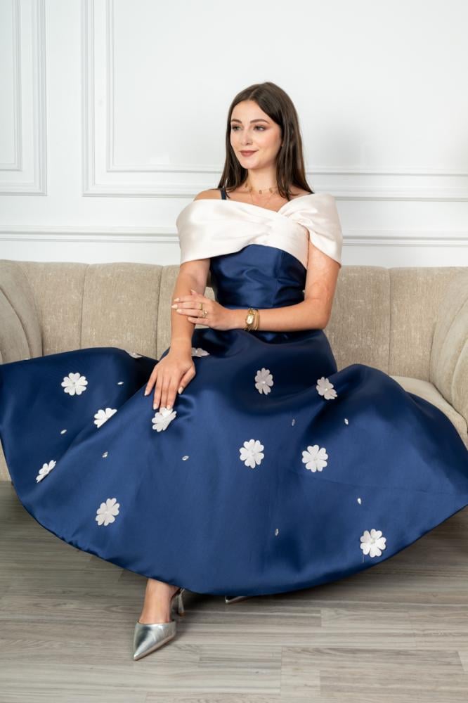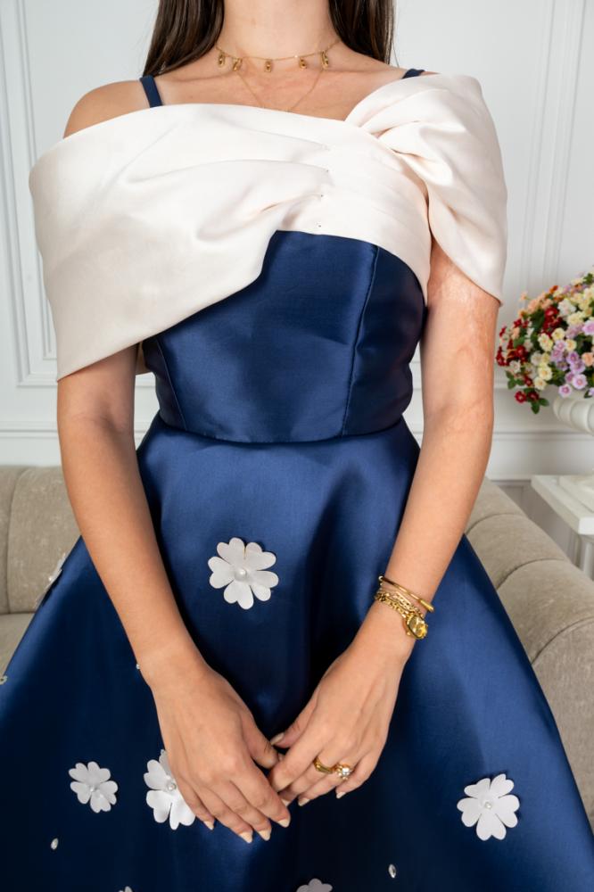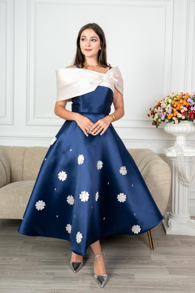 فستان سهرة أزرق ملكي مزين بالزهور البيضاء
