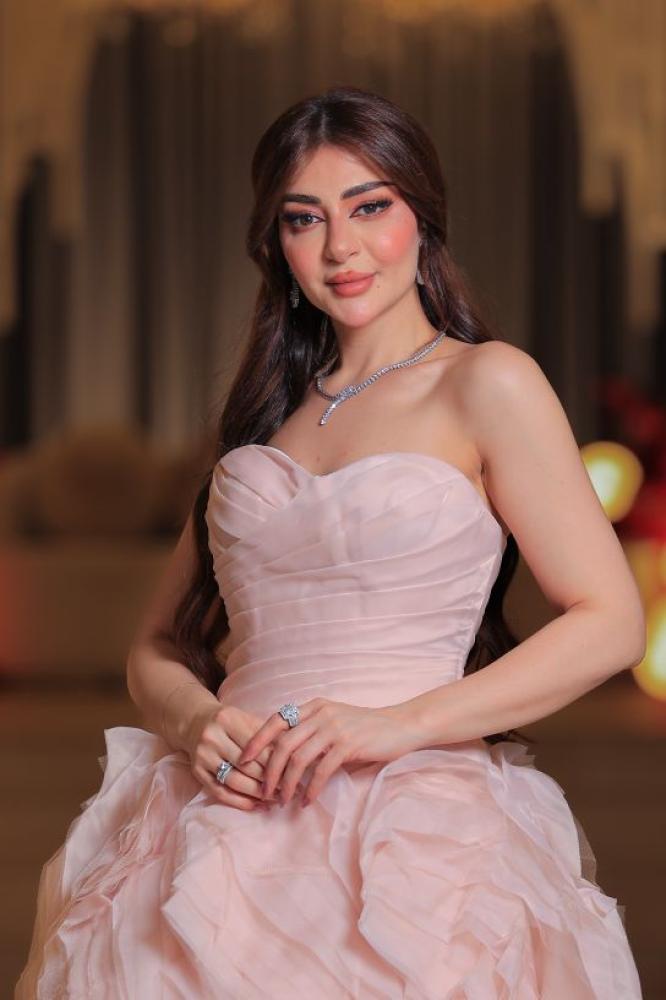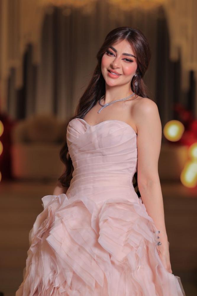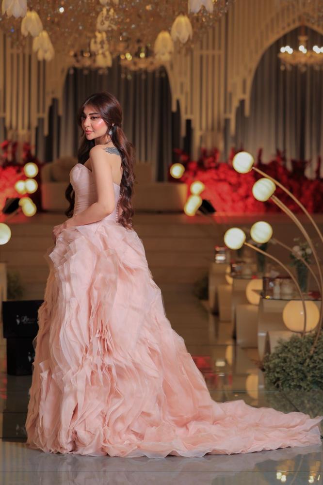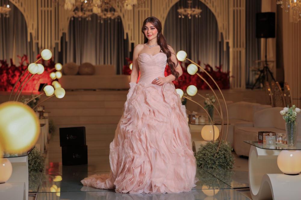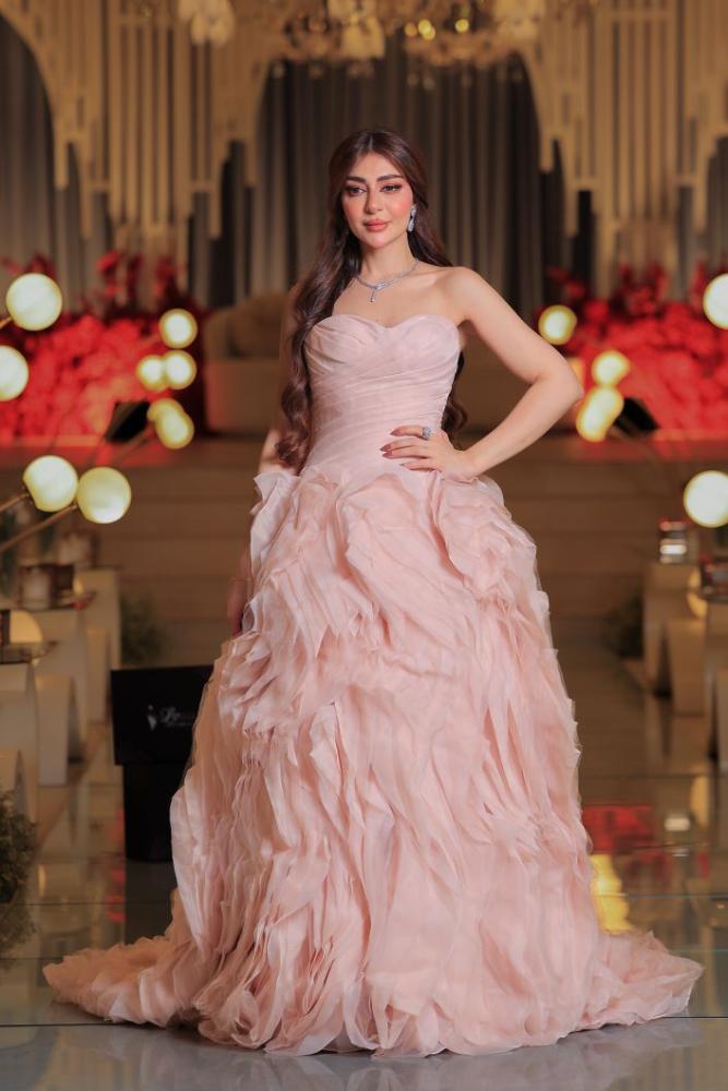 فستان سهره راقٍ مستوحى من قصص الأميرات، يأتي بلون وردي ناعم يناسب مختلف ألوان البشرة.