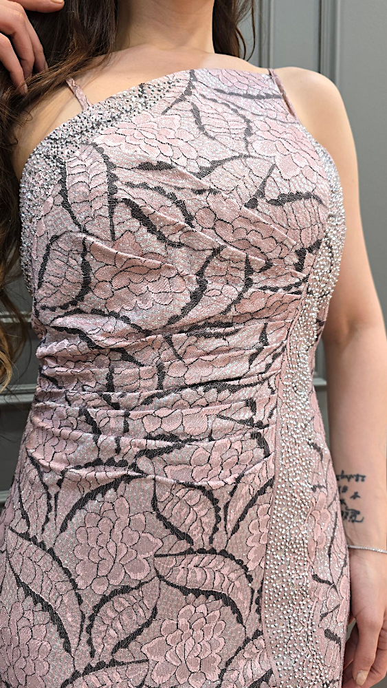 تألقي بإطلالة تخطف الأنظار مع فستانك الناعم المصمم بقصّة ضيقة تبرز أنوثتك بكل رقي. يأتي بلون زهري أنيق ونقوش فنية ناعمة باللون الداكن مع تطريز لامع يمر من منتصف الفستان ليضفي عليه لمسة من التميز والفخامة. تصميم الكتف الواحد يزيد من جاذبيته ويجعله مثاليًا لمناسبات المساء الفاخرة.