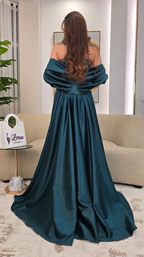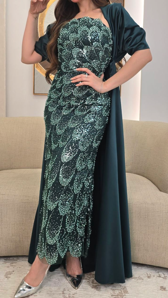 فستان أخضر زمردي بترتر لامع وشال جانبي فاخر