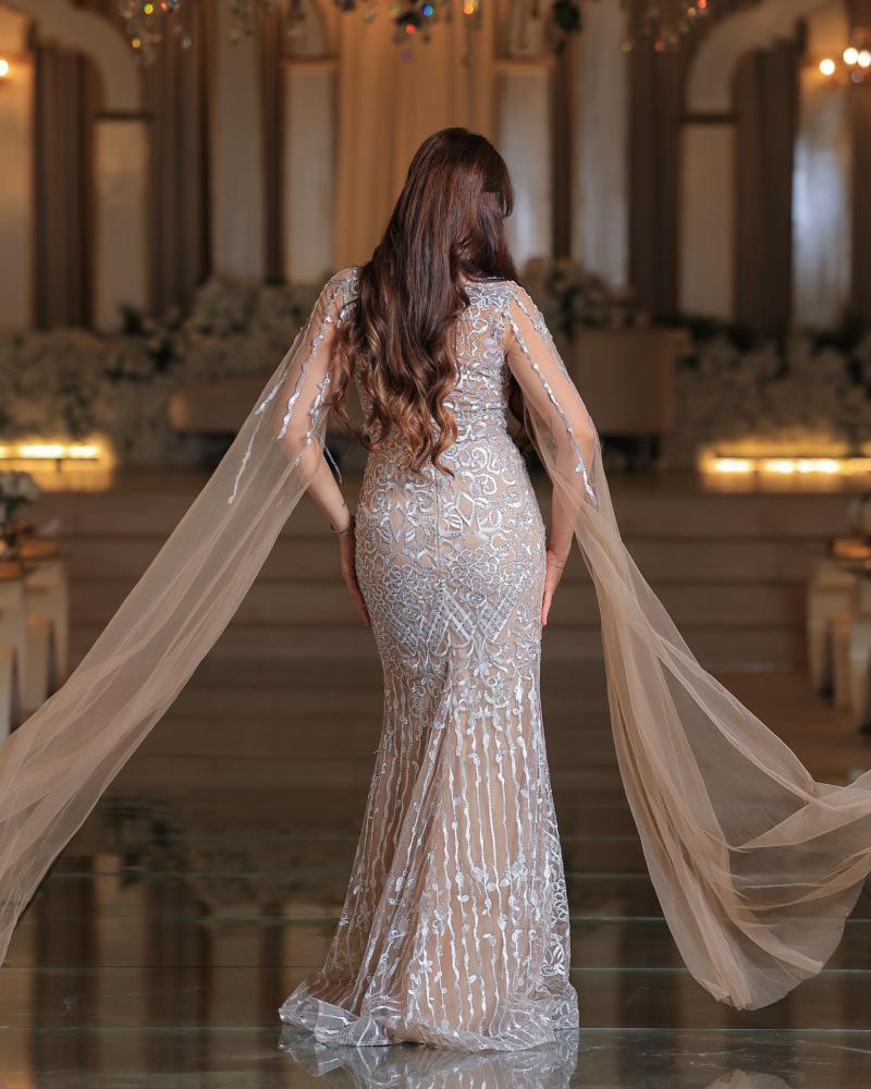 فستان سهرة بيج بتصميم فاخر ومطرز بالخرز والأكمام الشفافة الطويلة