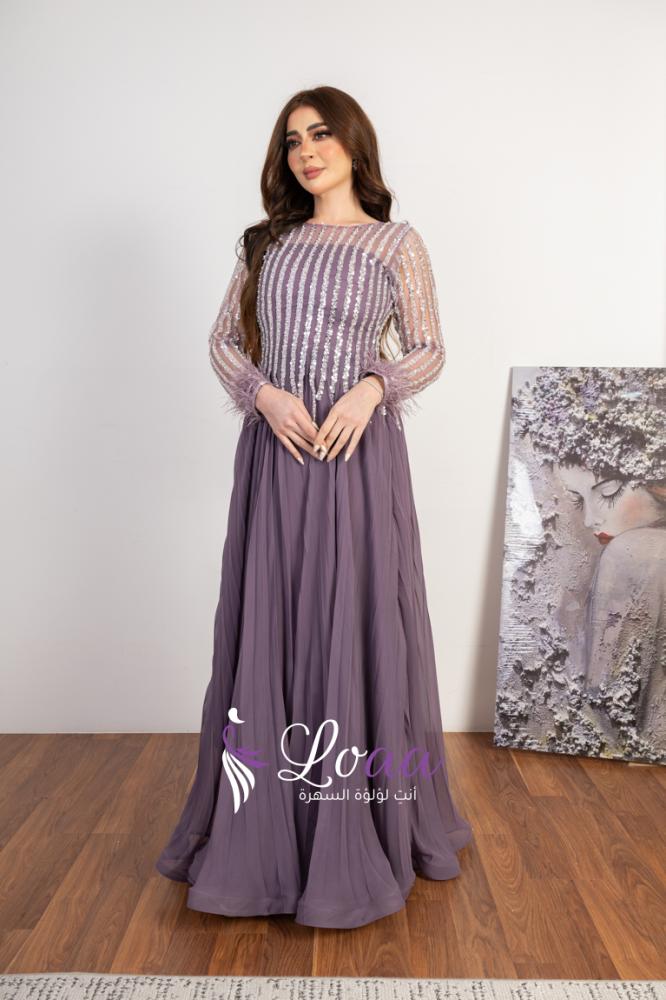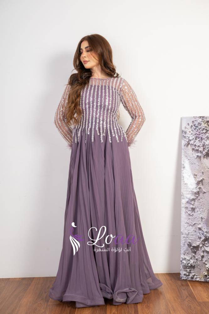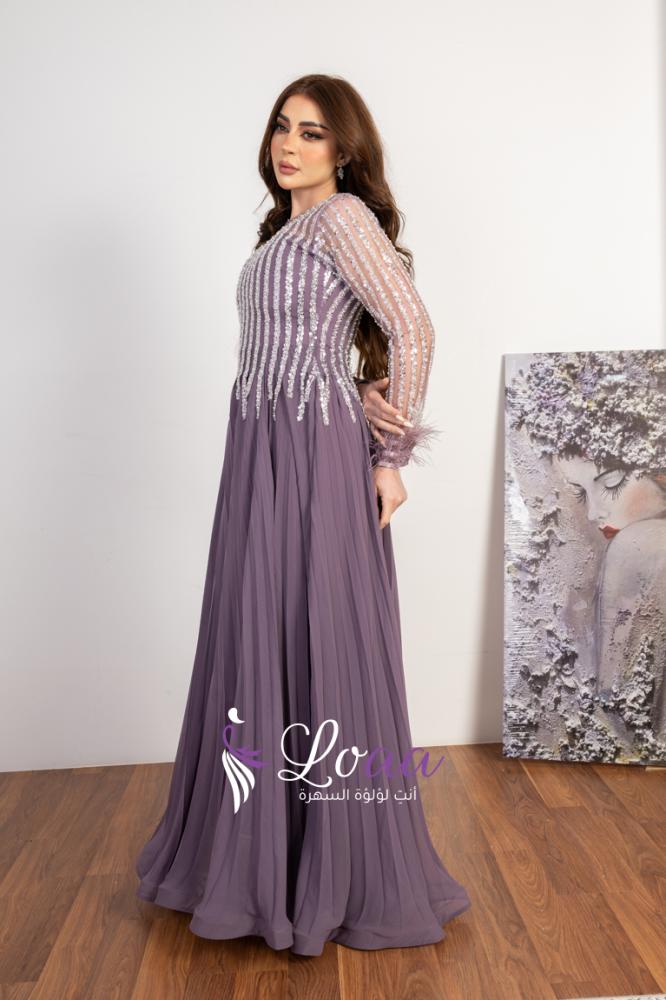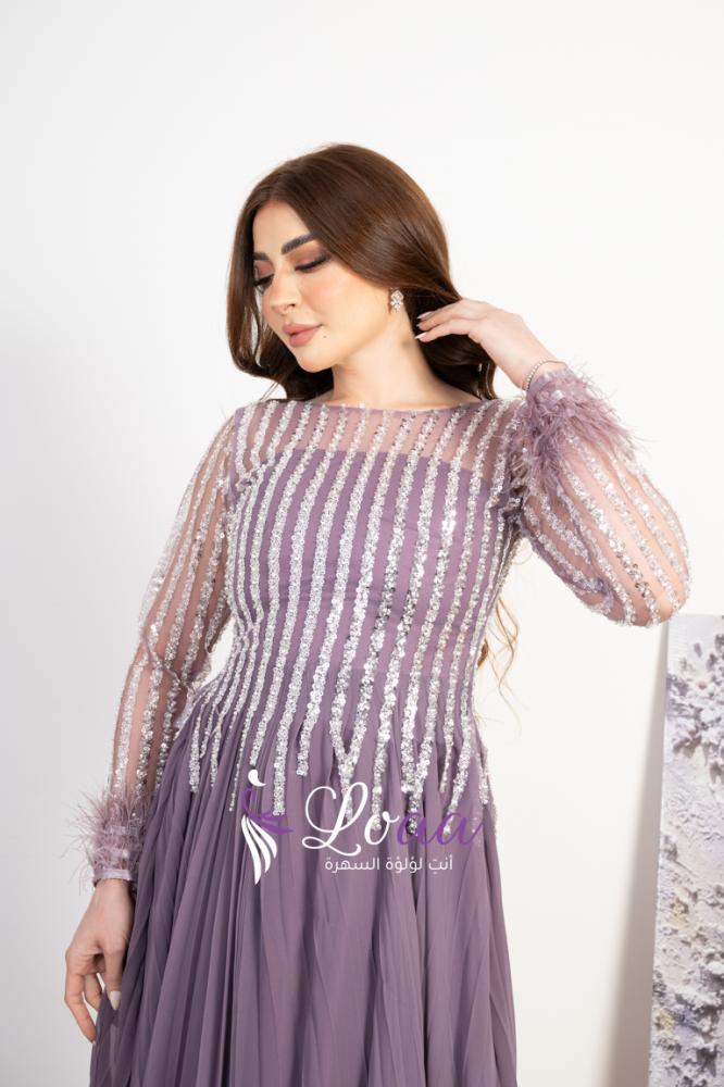 فستان سهرة لافندر مزخرف بالخرز مع أكمام من الريش