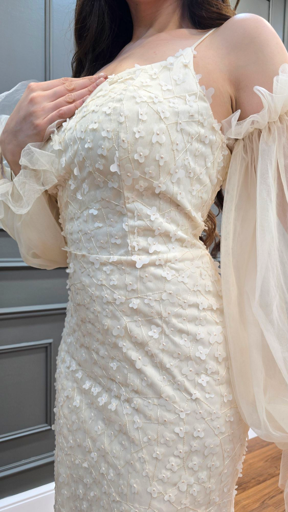 فستان سهرة ناعم بأكمام منفوشة باللون السكري