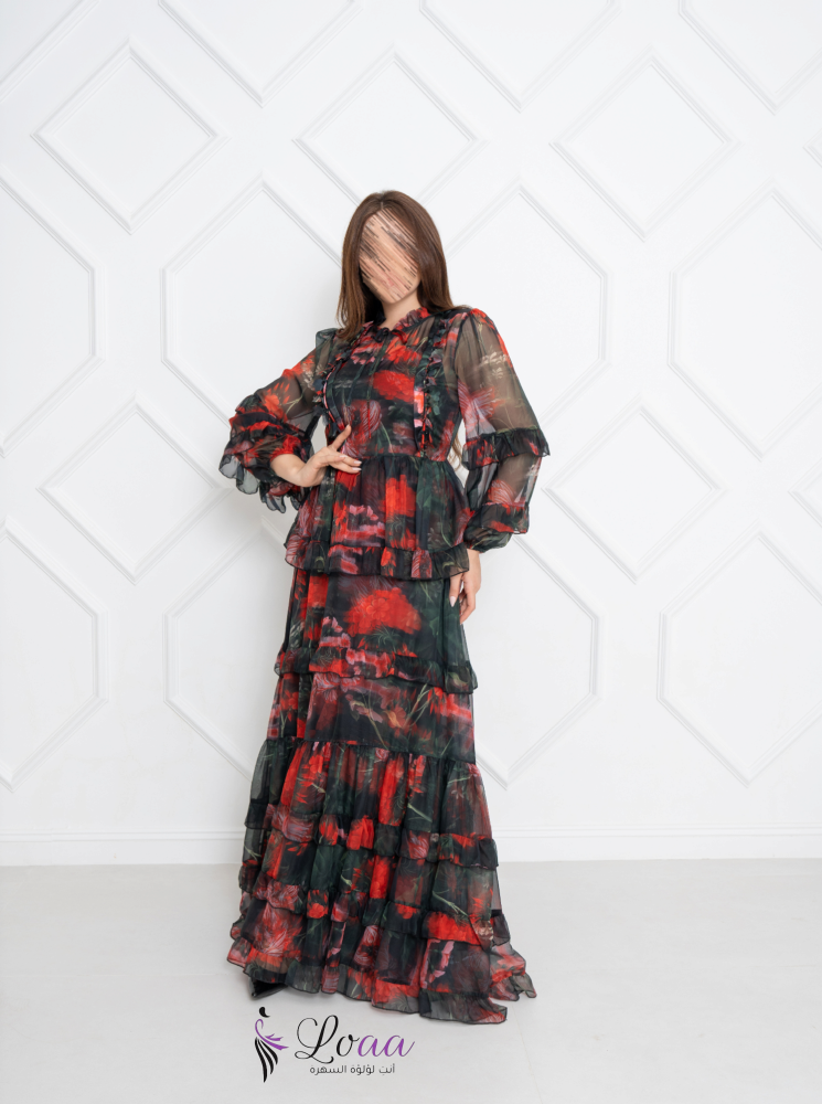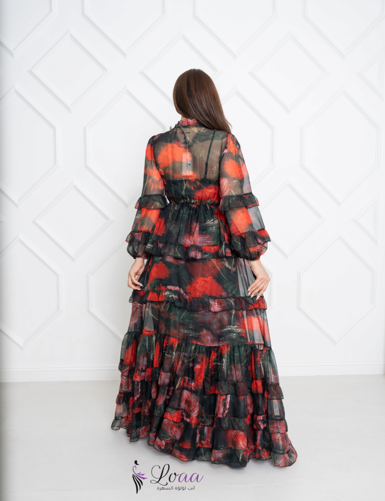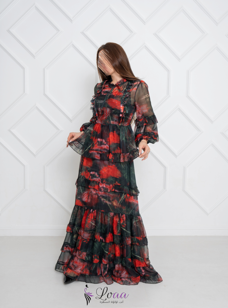 فستان طويل بطبعة زهور حمراء وسوداء مع طبقات
