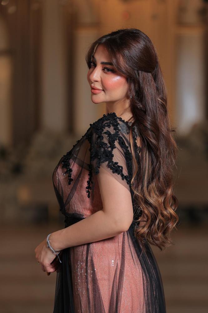 استمتعي بإطلالة راقية لا تُنسى مع هذا الفستان الوردي البراق المصمم بتفاصيل ملكية. يتميز الفستان بقصة ضيقة تُبرز القوام، ويعلوه كيب من التول الأسود الشفاف المزين بتطريز دانتيل فاخر على الأكتاف والحواف، مما يضفي على التصميم لمسة درامية ساحرة.
