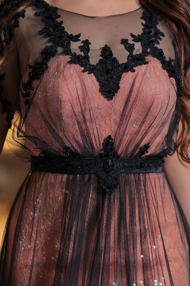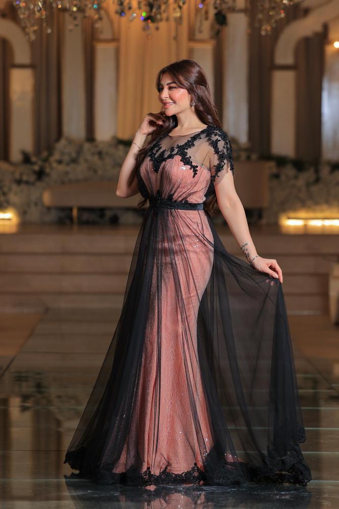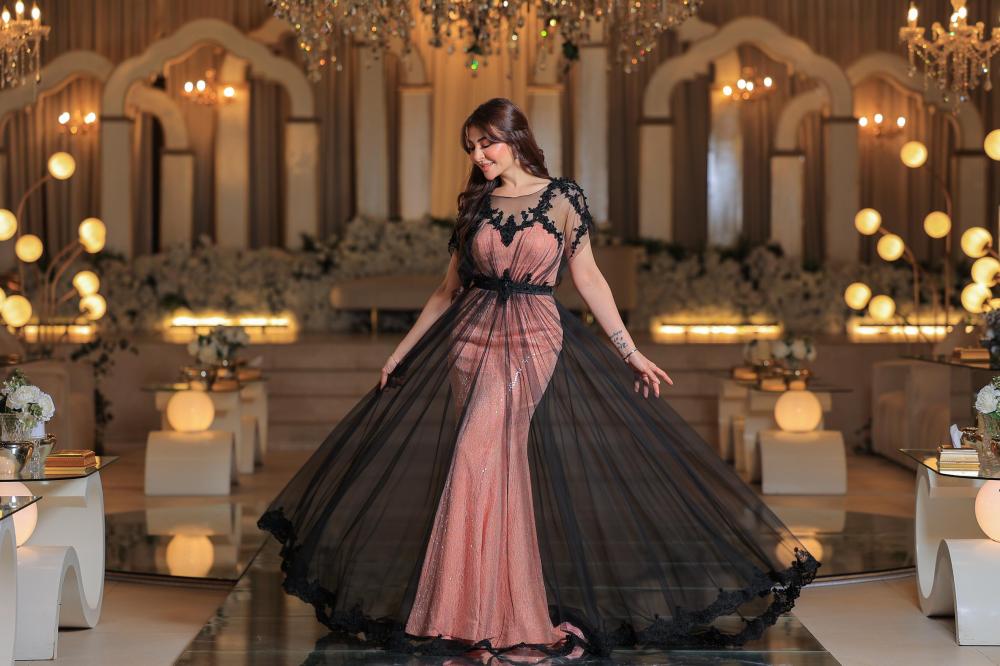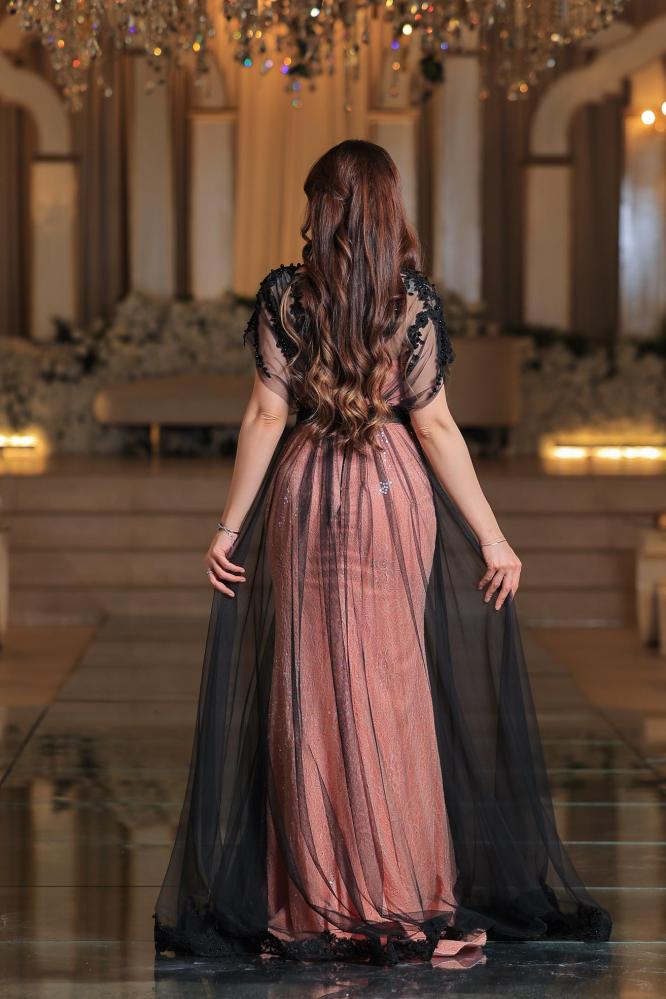 فستان وردي براق مع كيب تول أسود وتطريز دانتيل فاخر