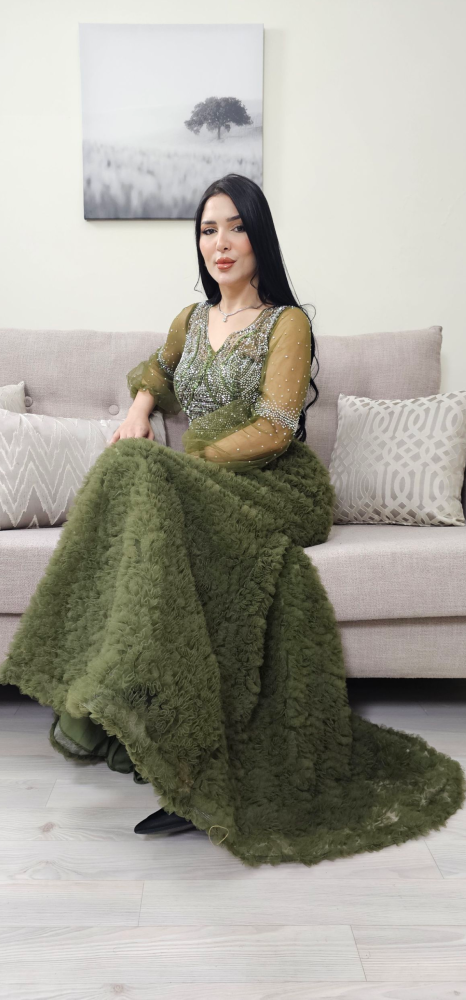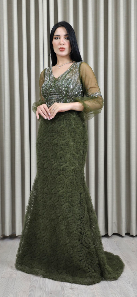 فستان سهرة فاخر باللون الأخضر الزيتوني الداكن، يجمع بين الأناقة الكلاسيكية والفخامة العصرية.