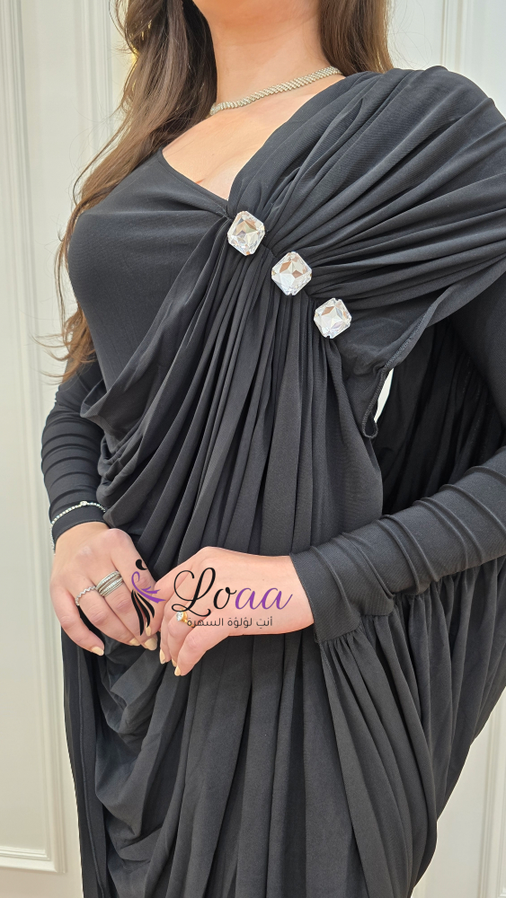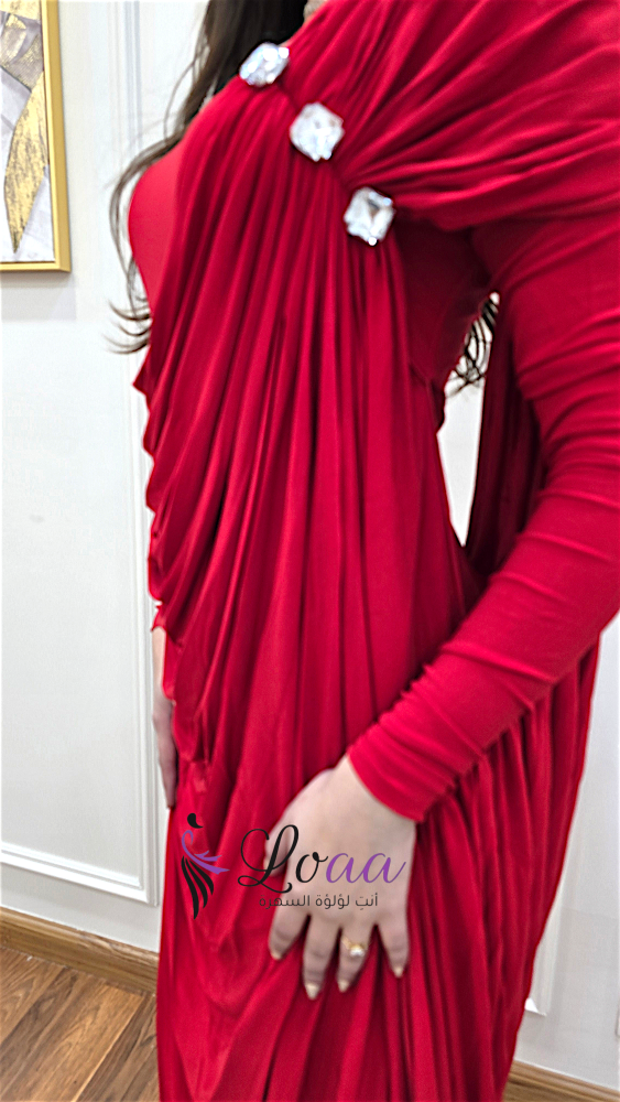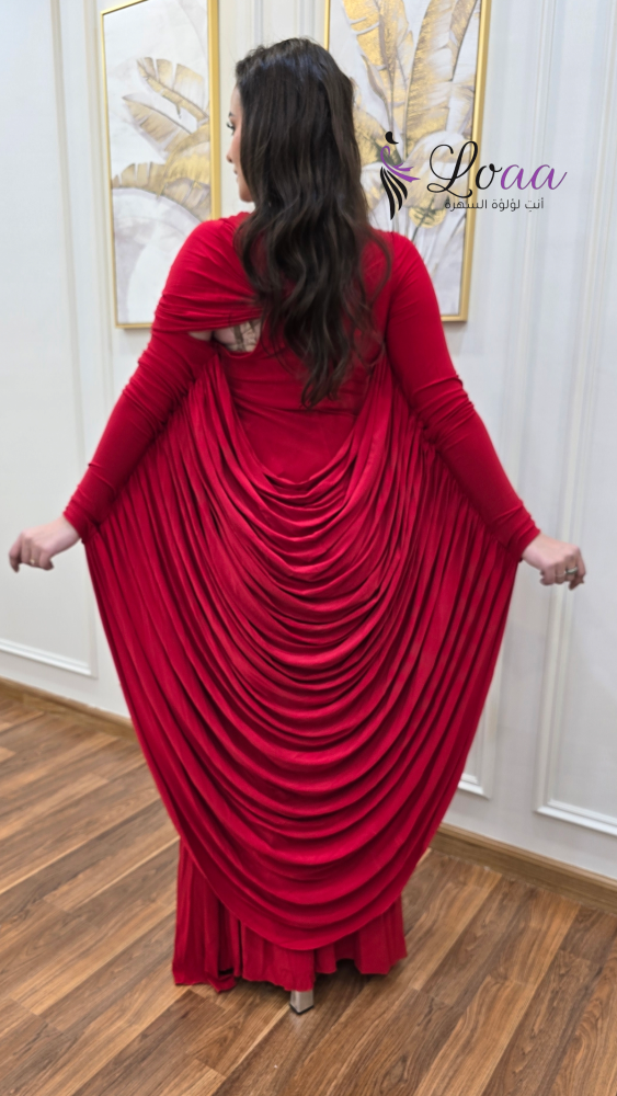 فستان فريد من نوعه بلونيه الملكيين ، مصنوع من قماش الكريب الناعم الذي ينسدل على الجسم بأناقة. يتميز بتصميم طيات ملتفة تمتد من الأمام إلى الخلف، مما يضيف لمسة من الفخامة والحركة الديناميكية. الأكمام الطويلة تضفي لمسة من الرقي، مع تفاصيل صغيرة على الكتف مزينة بأحجار براقة لإبراز جمال التصميم. الظهر مصمم بأسلوب الكيب الملتف ليمنح إطلالة ملوكية تلفت الأنظار.