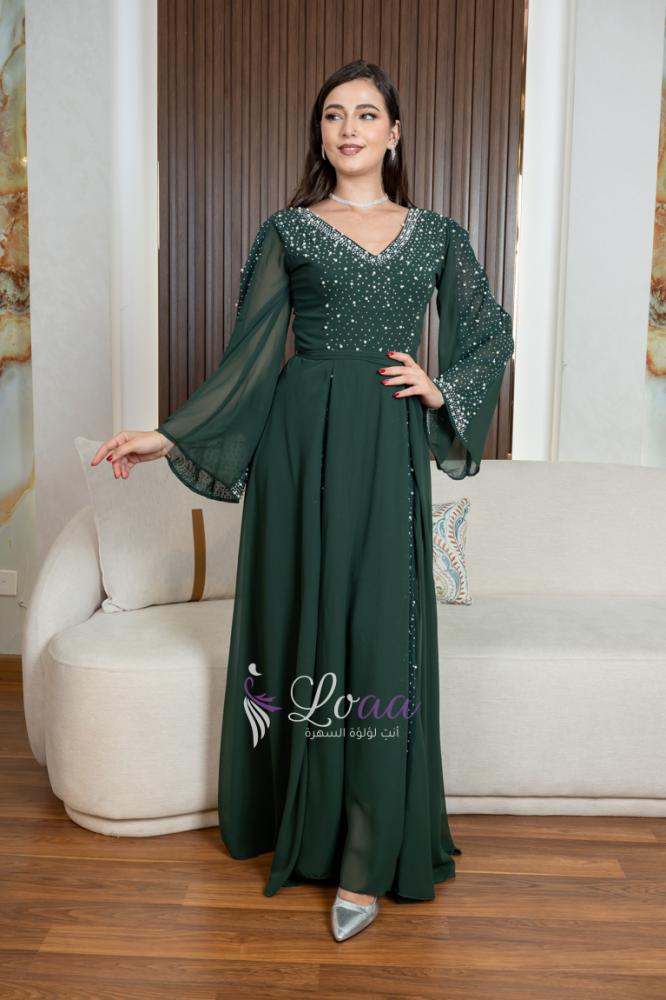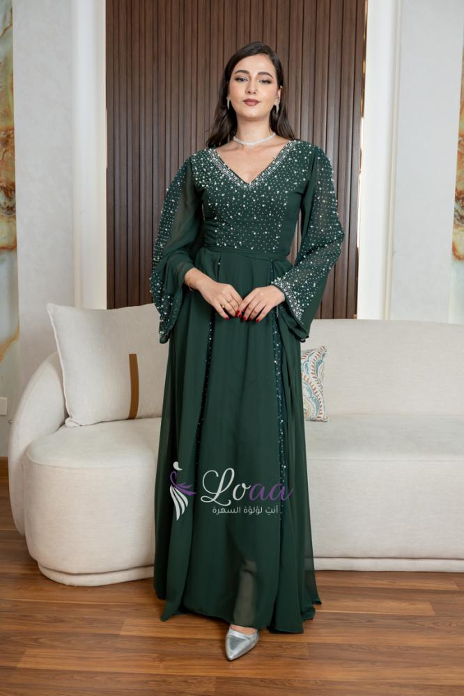 فستان سهرة أخضر مزين باللؤلؤ طويل الأكمام