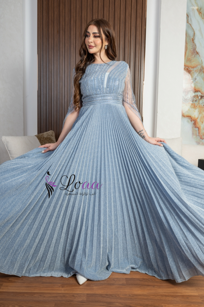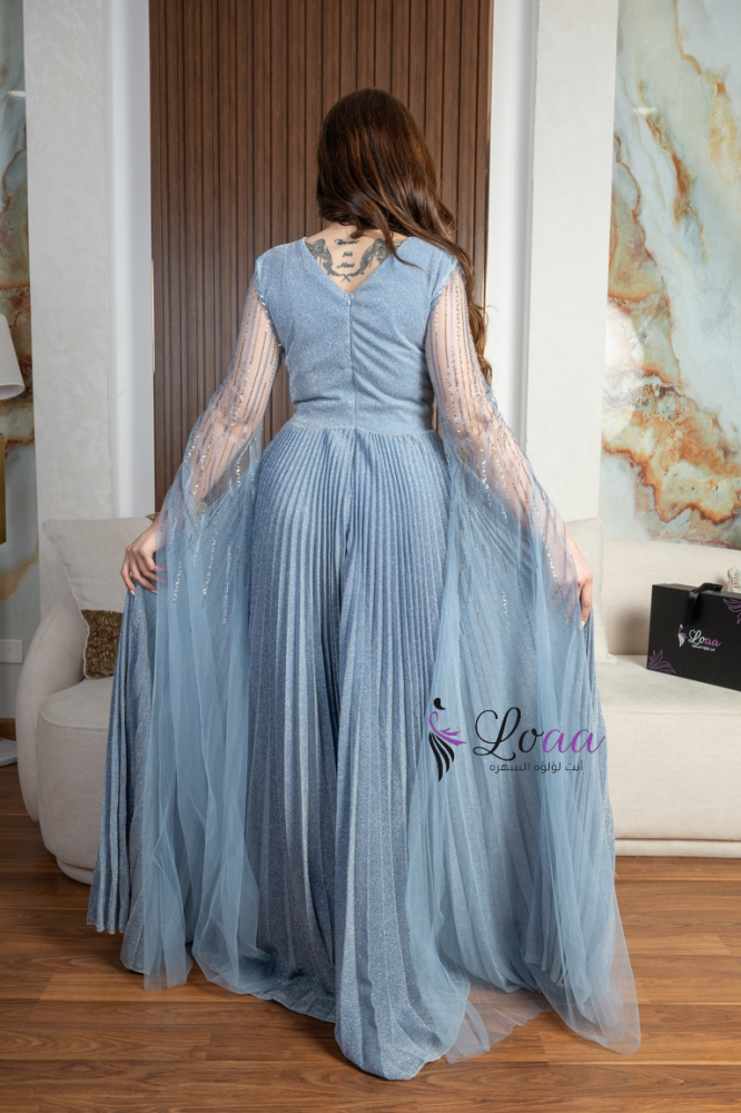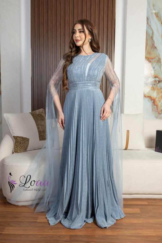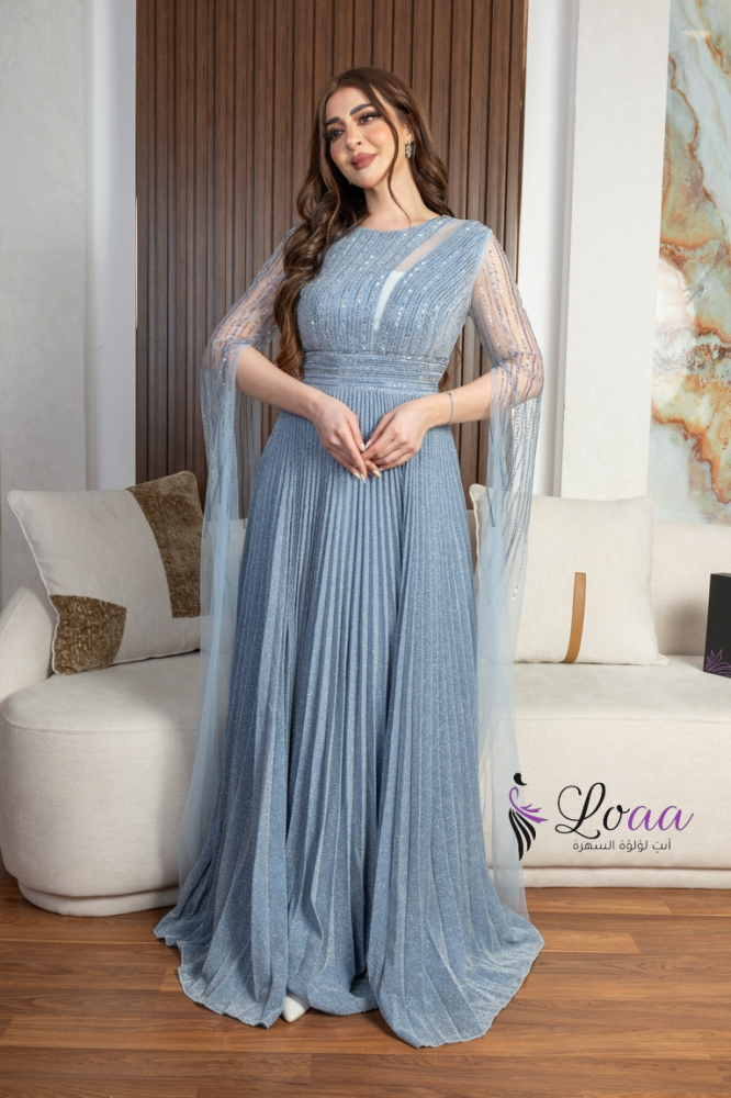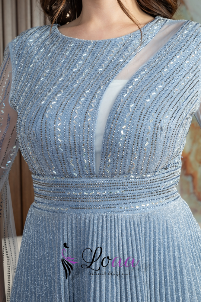 فستان سهرة أزرق طويل مطرز بأكمام شفافة ومشدود على الخصر