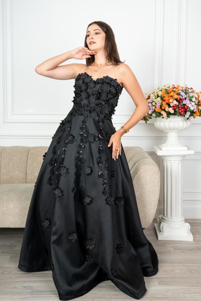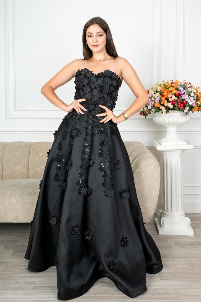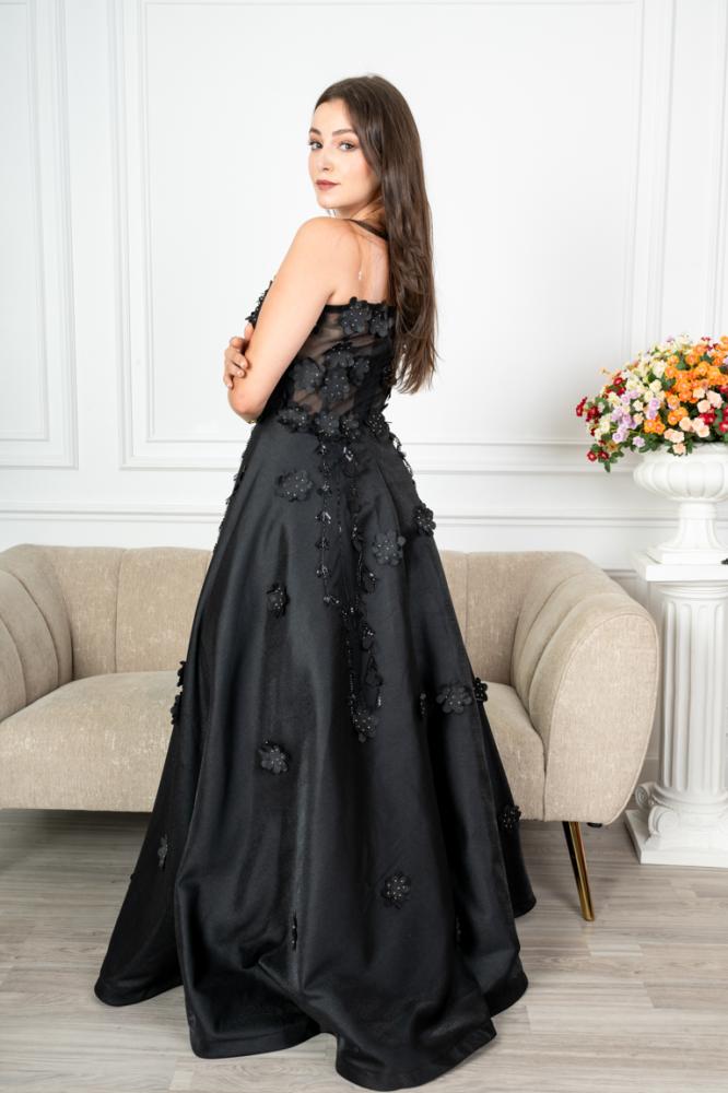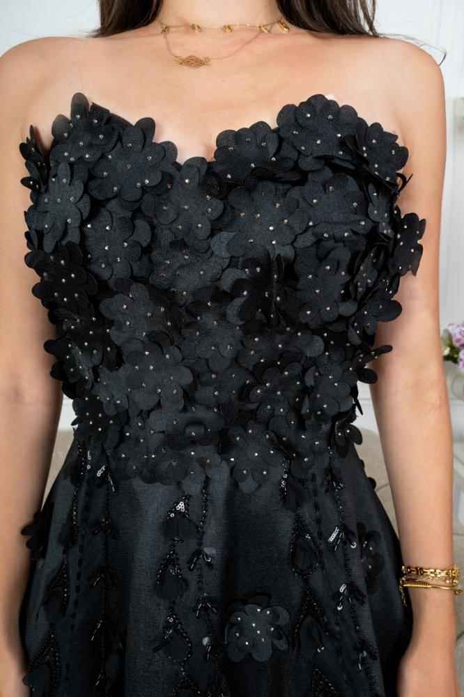 فستان سهرة أسود مزخرف بالزهور المترفة مع لمسات لامعة