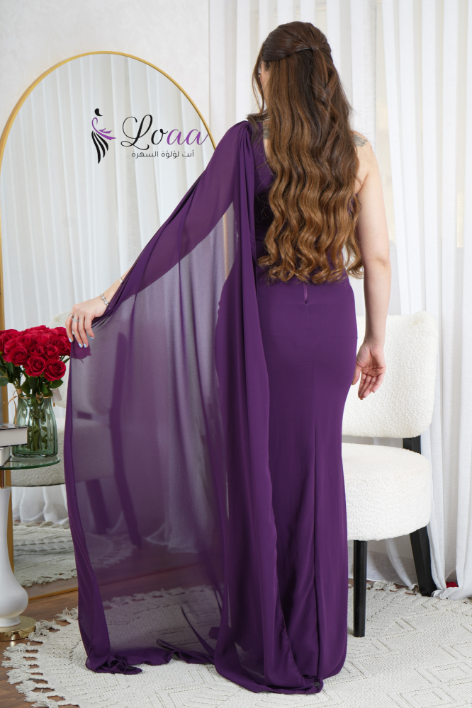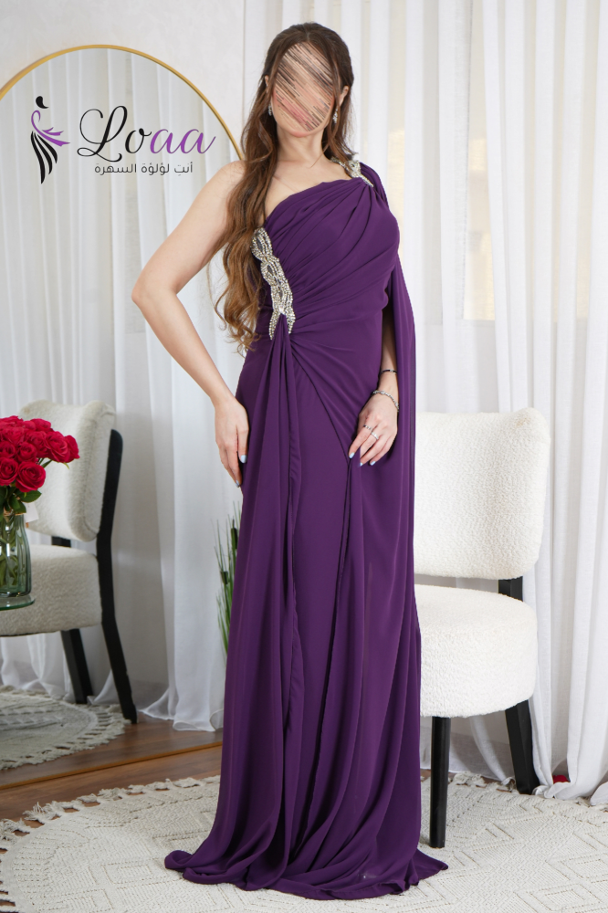 فستان سهرة بكتف واحد باللون الأرجواني مع شيفون شفاف وخرز لامع