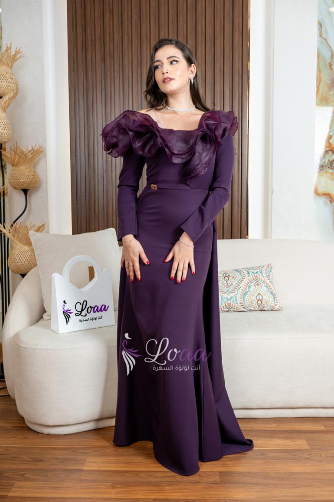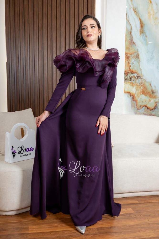 فستان سهرة بنفسجي بأكمام طويلة وقصة صدر مميزة بالشيفون