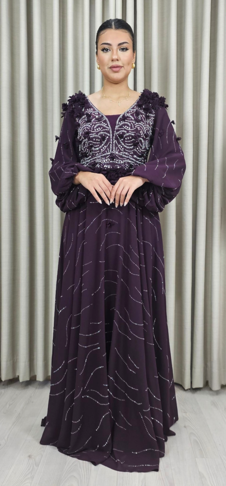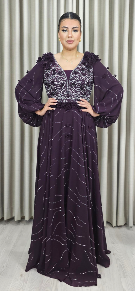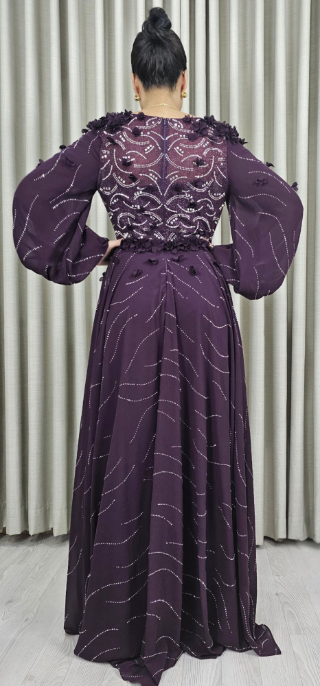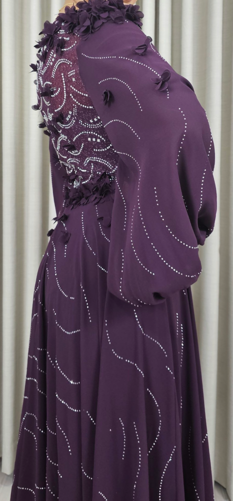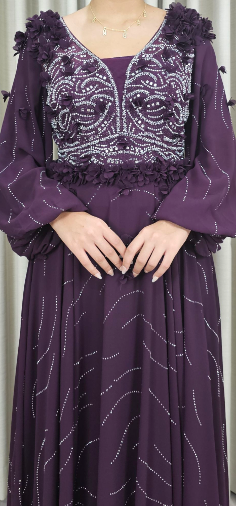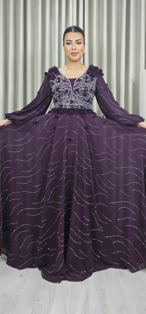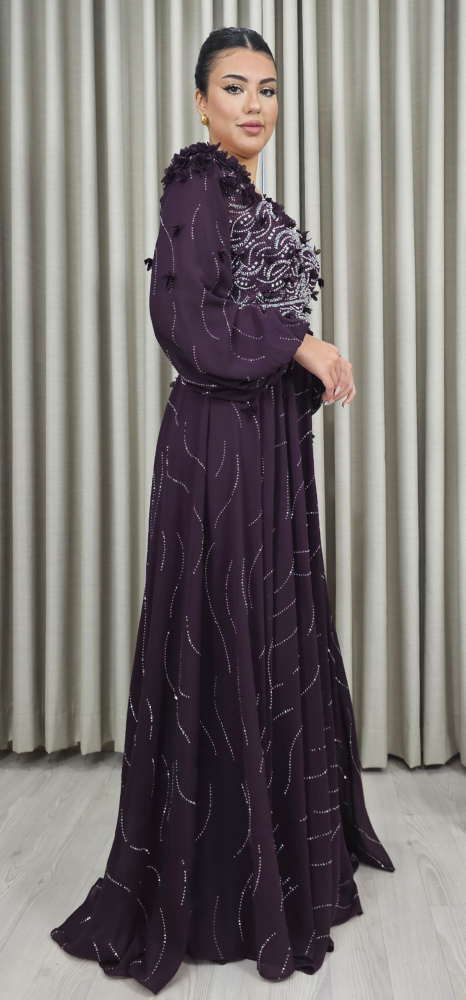 فستان سهرة بنفسجي مطرز بالترتر مع ورود بارزة وأكمام واسعة ملكية