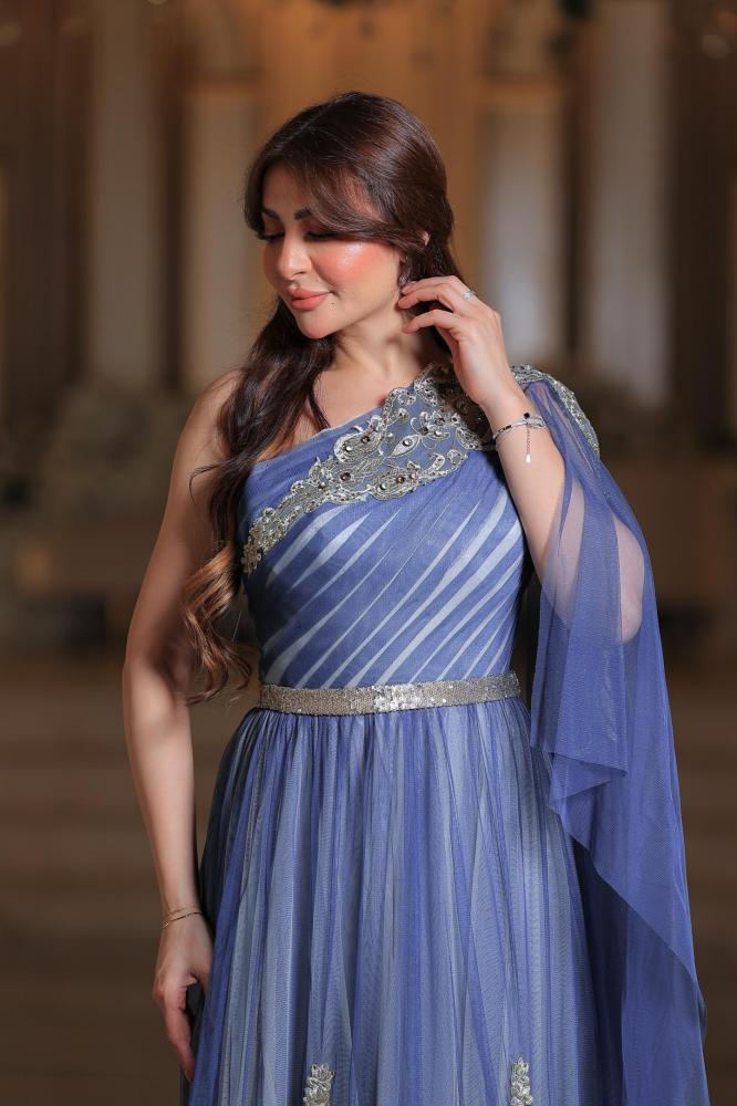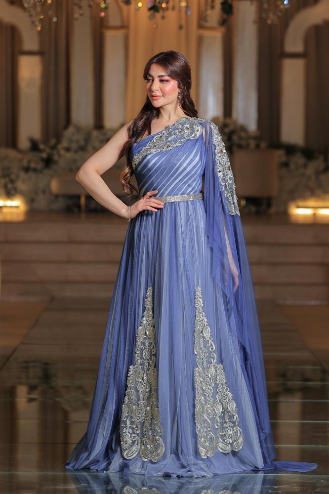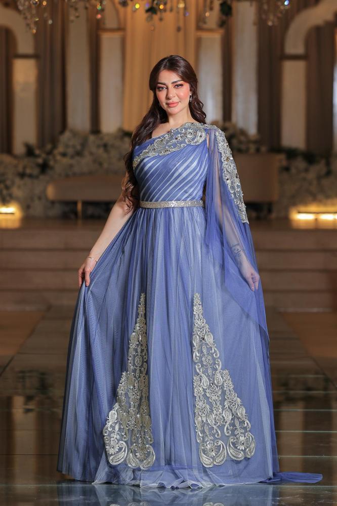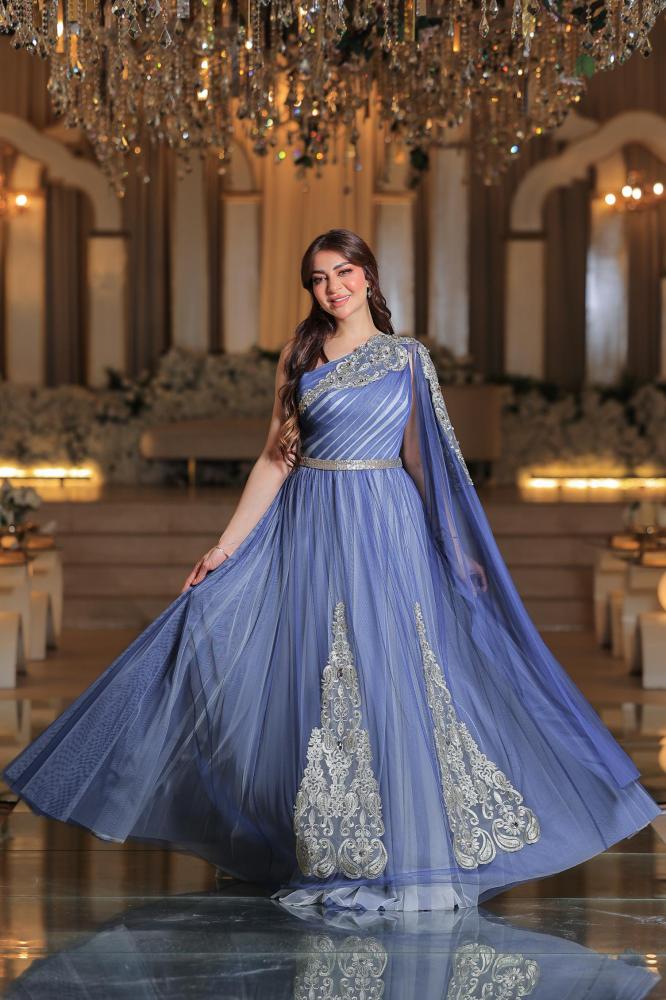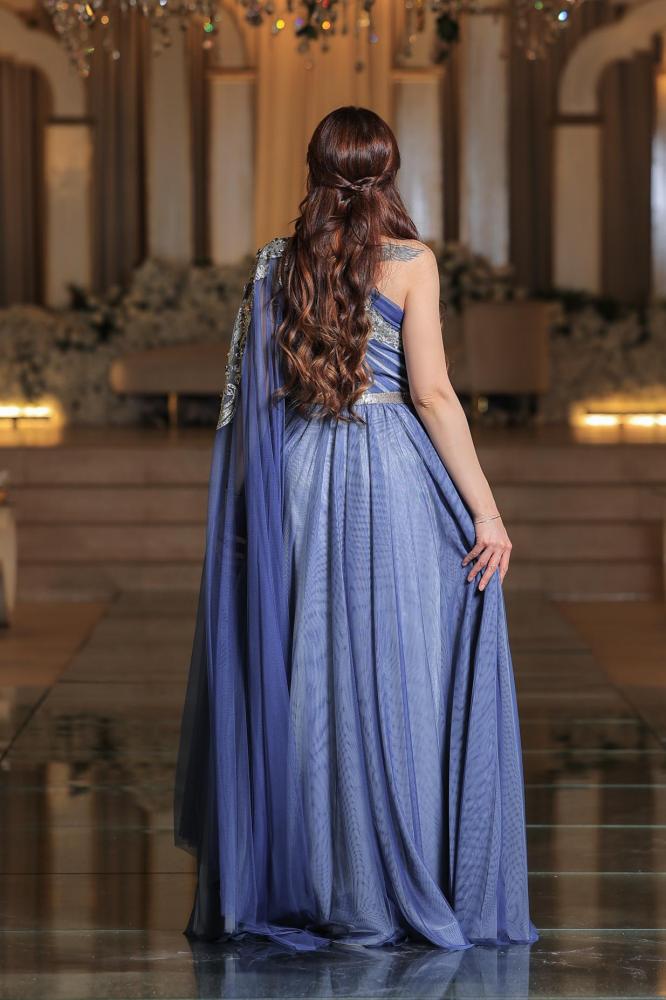 فستان سهرة سماوي مائل للبنفسجي بكتف واحد وتطريز فضي ملكي