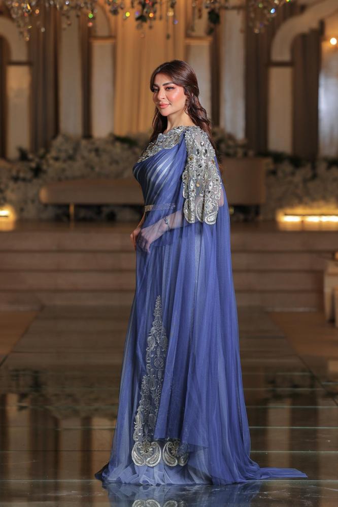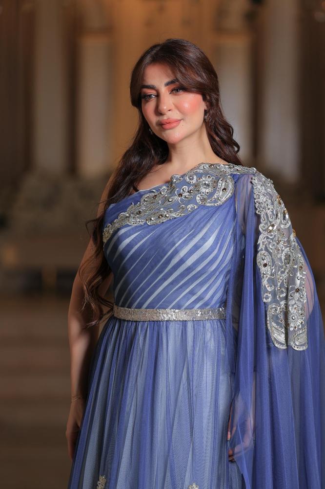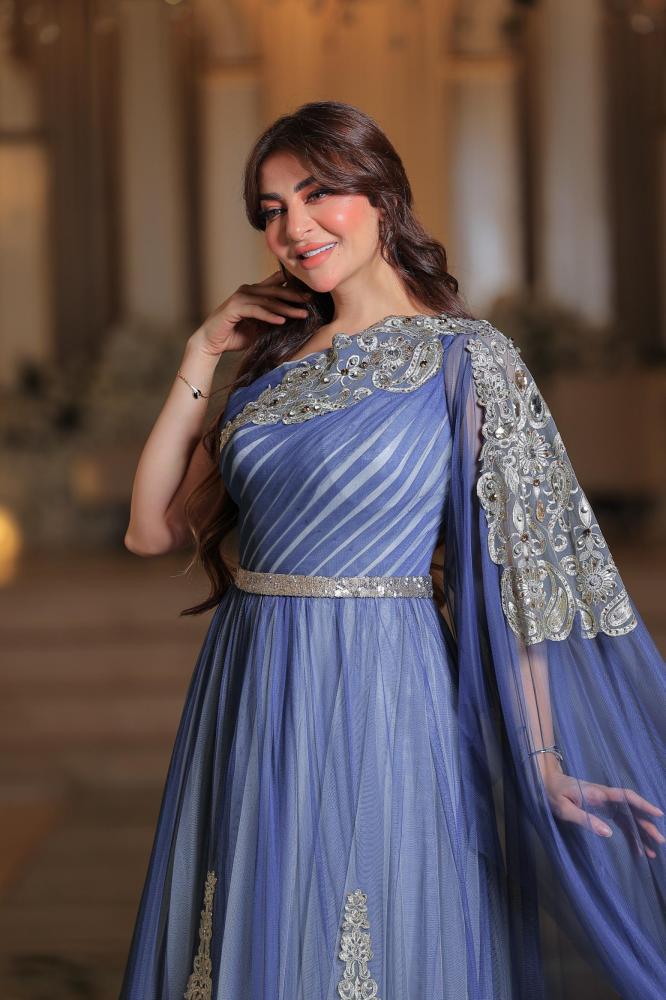 الجزء السفلي من الفستان منفوش بانسيابية ناعمة من طبقات التول الخفيف، تزينه زخارف تطريزية باللون الفضي بتفاصيل فنية بارزة على الجهتين، تضيف لمسة كلاسيكية أنيقة مستوحاة من الطراز الملكي. كما تميز الكم الواحد الطويل المنسدل من الكتف بخامة شفافة مزينة بالتطريز لتكتمل الروعة.