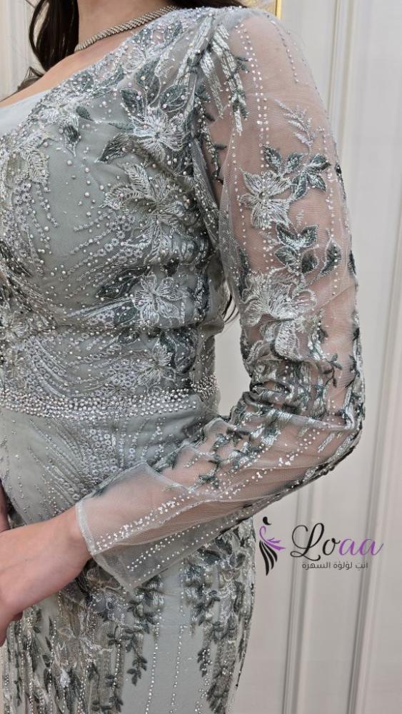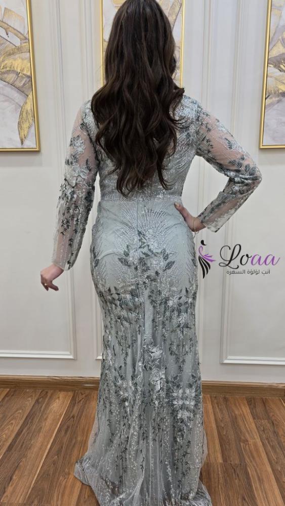 فستان سهرة أنيق باللون الفضي مع تصميم ملكي جذاب. يتميز بقصة انسيابية تحدد الجسم وتبرز تفاصيله الرائعة، مع تطريز زهور بارزة تضيف لمسة فاخرة على القماش الشفاف. الأكمام الطويلة الشفافة المزينة بتطريزات دقيقة تضفي لمسة عصرية، بينما الخصر المزين بالأحجار اللامعة يعزز من جمال التصميم. مناسب للمناسبات الفخمة وحفلات الزفاف.