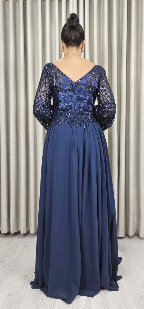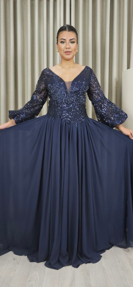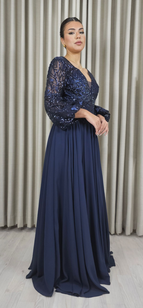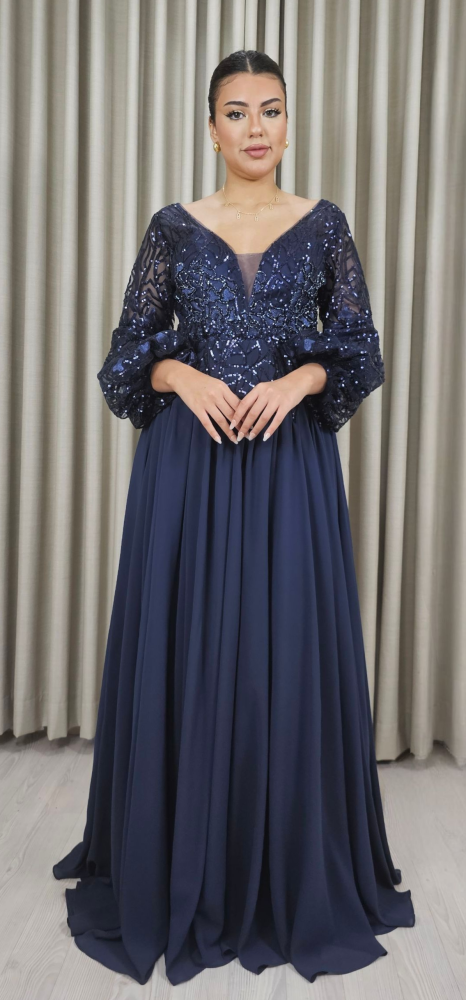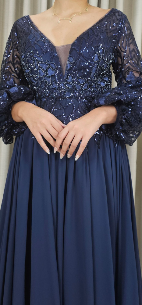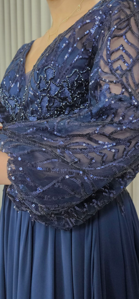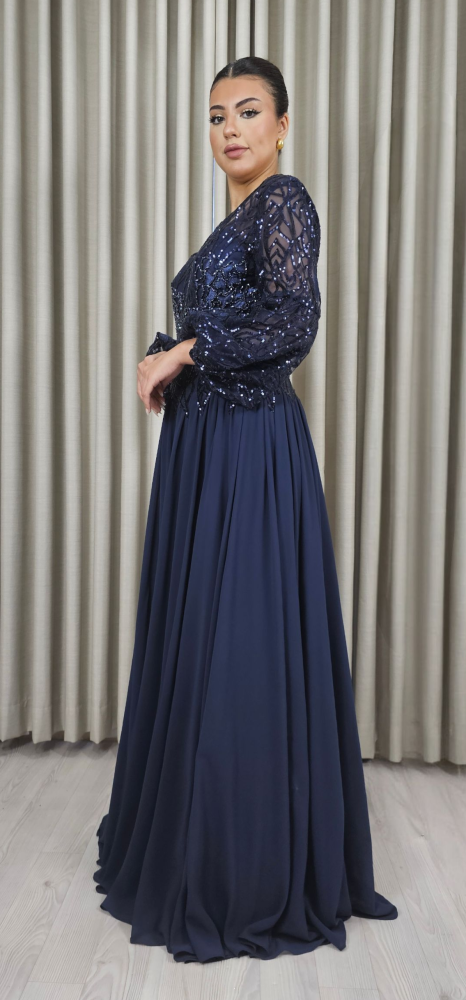 فستان سهرة كحلي مطرز بالترتر مع أكمام شفافة واسعة وتنورة شيفون منسابة