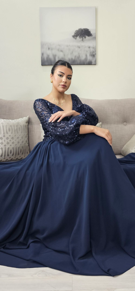فستان سهرة ملكي باللون الكحلي الداكن، يتميز بتصميم فاخر يجمع بين الفخامة والراحة.
